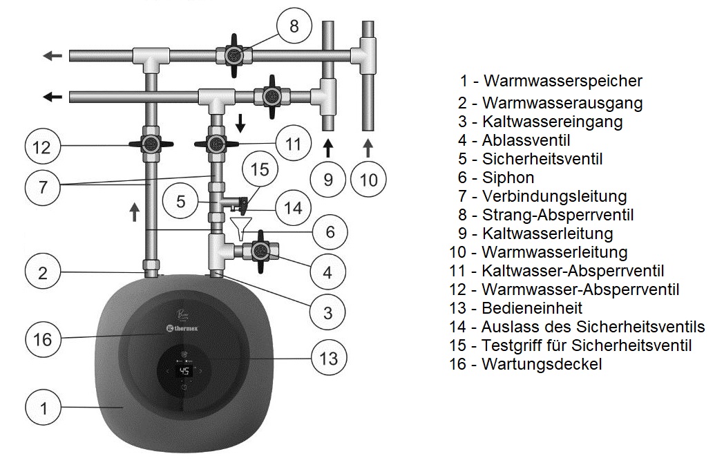 - Der Warmwasserspeicher muss in einem frostfreien und gut belüfteten Raum installiert werden.