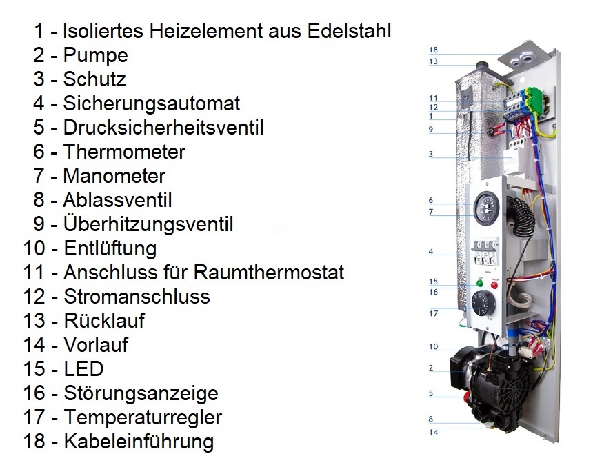 Die Temperatur des Heizelementes lässt sich nahezu stufenlos in einem Bereich von 5°C bis 70°C einstellen. Hierzu lassen sich drei Leistungsstufen einschalten. Je nach Leistungsstufe wird hierbei aber zwingend eine höhere Absicherung nötig sein. Das Gerät lässt sich zudem mit einem externen Raumthermostat steuern um Ihren Stromverbrauch zusätzlich zu minimieren. Desweiteren besitzt das Heizelement eine Pumpe.