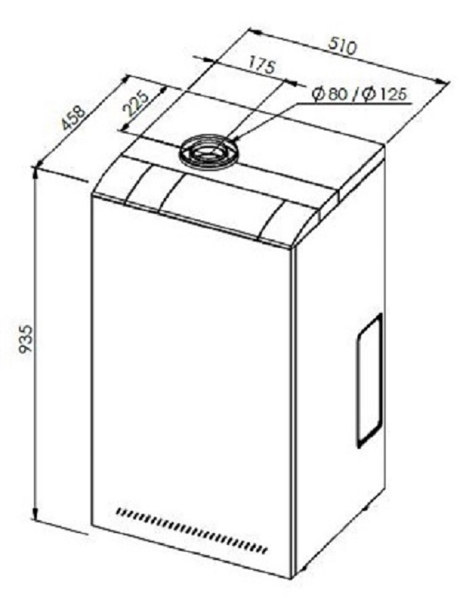 Das Koaxialrohr hat eine Länge von 250 mm und eine Kontrollöffnung für das Überprüfen der Frischluft und dem Abgasweg in Brennwertanlagen mit 80/125 mm Durchmesser. In dieser Ausführung werden die Rauchgase durch ein innenliegendes Polypropylenrohr mit einem Durchmesser von 80 mm geleitet und die Verbrennungsluft wird durch ein Außenrohr mit einem Durchmesser von 125 mm angesaugt.