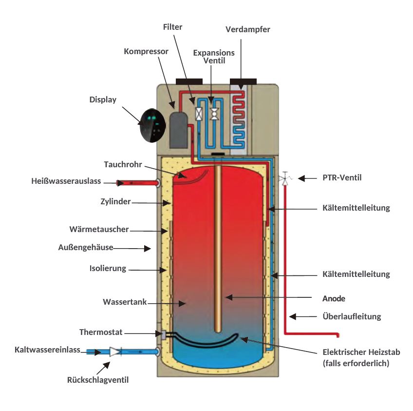 - Wärmetauscher (Kondensator): Hier gibt das Kältemittel die aufgenommene Wärme an das Wasser ab. Das Kältemittel kühlt ab, kehrt vom gasförmigen in den flüssigen Zustand zurück und gibt die Wärmeenergie an den Wasserspeicher ab.