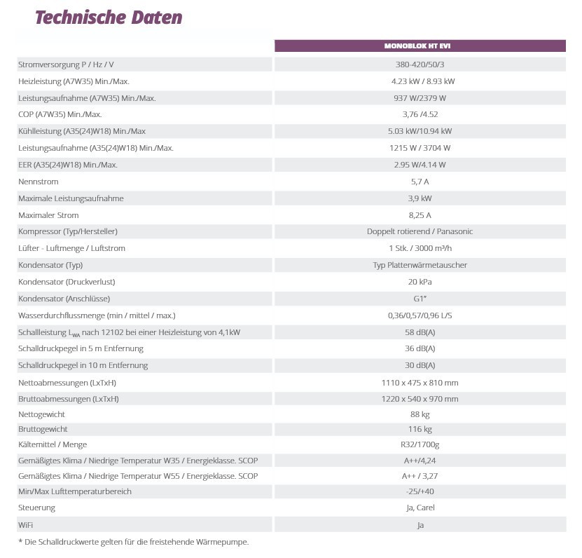 | Kompressor | Panasonic Doppelrotationskompressor (EVI Inverter) |