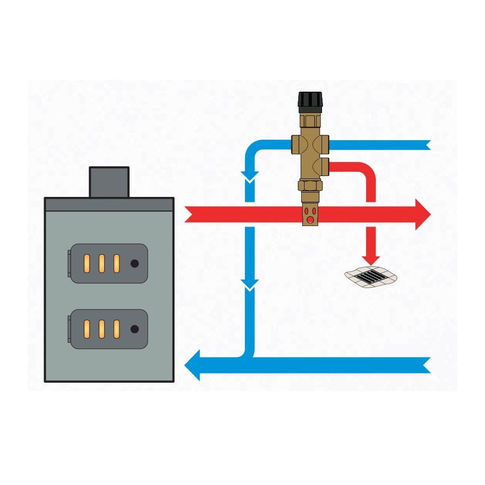 Das 2-Wege-Ventil leitet das heiße Wasser des Heizkesselvorlaufs durch den unteren Anschluss, kaltes Wasser zum Abkühlen des Heizkessels wird durch den oberen Anschluss geführt. Ist eine Temperatur von 97°C erreicht, öffnet das Ventil die beiden Anschlüsse, dadurch wird durch den unteren Anschluss heißes Wasser des Heizkessels abgeführt und kaltes Wasser aus der Wasserleitung durch den oberen Anschluss in den Rücklauf zugeführt.
